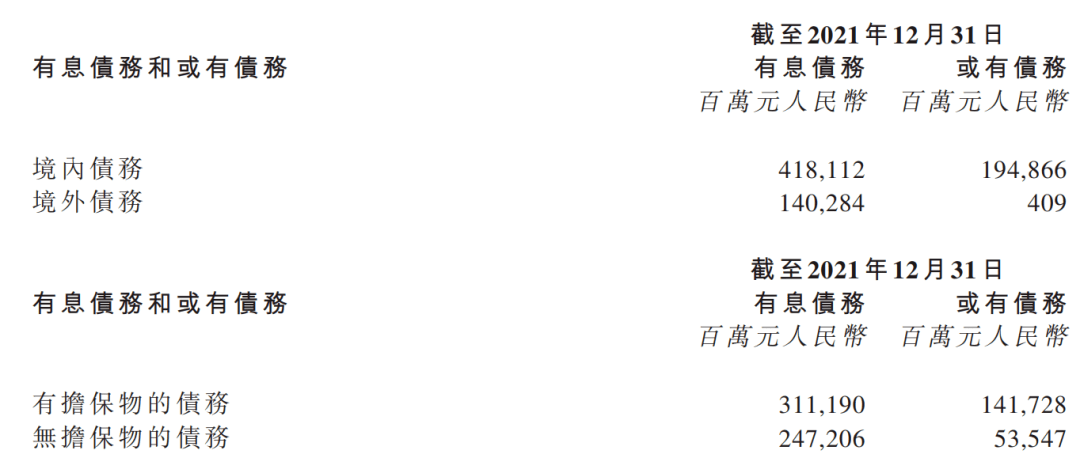 而根据公告,恒大未经审计的示意性财务信息显示,截至2021年12月31日, 公司的有息债务在合并基础上总额约为5584亿元,或有债务约1953亿元,仅境内外有息及或有债务总额就高达7537亿元。其中,对合营企业、联营企业及第三方借款的担保余额约1020亿元,未触发的股权回购义务约933亿元。