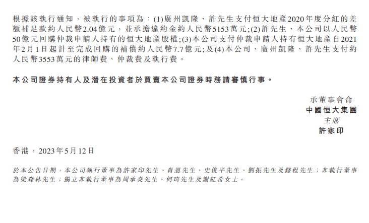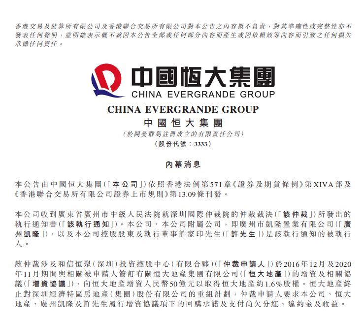 公司收到广东省广州市中级人民法院就深圳国际仲裁院的仲裁裁决所发出的执行通知书。公告称,公司、附属公司,即 广州市凯隆置业有限公司以及公司控股股东及执行董事许家印是该执行通知的被执行人。