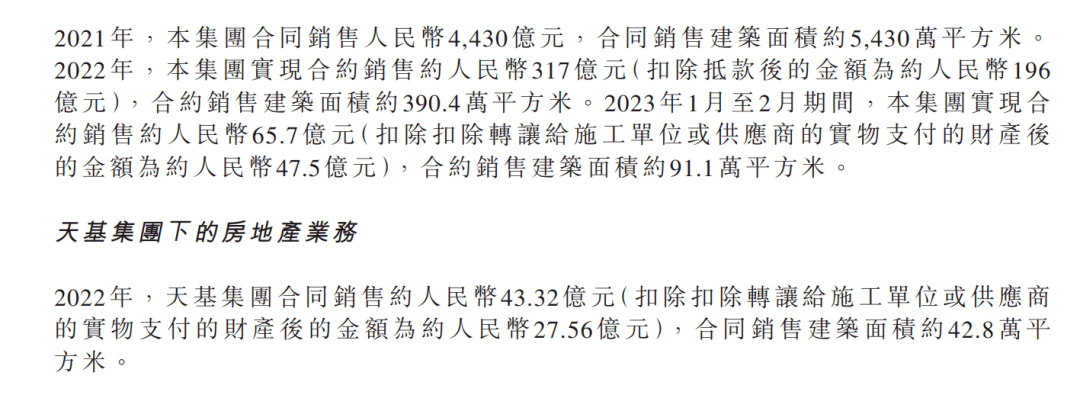 房地产业务方面,2021年,恒大地产实现合同销售4430亿元;2022年,恒大地产实现合同销售约317亿元,天基集团为43.32亿元;2023年1月至2月,恒大地产实现合同销售约65.7亿元。物业管理业务方面,恒大物业2021年实现收入约145.86亿元。
