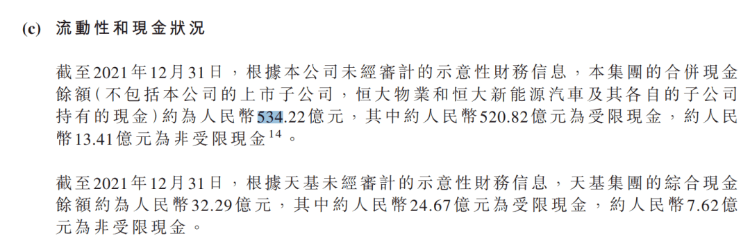 据中国恒大今年3月22日发布的公告显示,恒大集团现金余额(不包括恒大集团的上市子公司、恒大物业和恒大汽车及其各自的子公司持有的现金)约为534.22亿元, 仅13.41亿元为非受限现金;天基集团的综合现金余额约为32.29亿元,7.62亿元为非受限现金。恒大的可支配现金仅有21.03亿元。