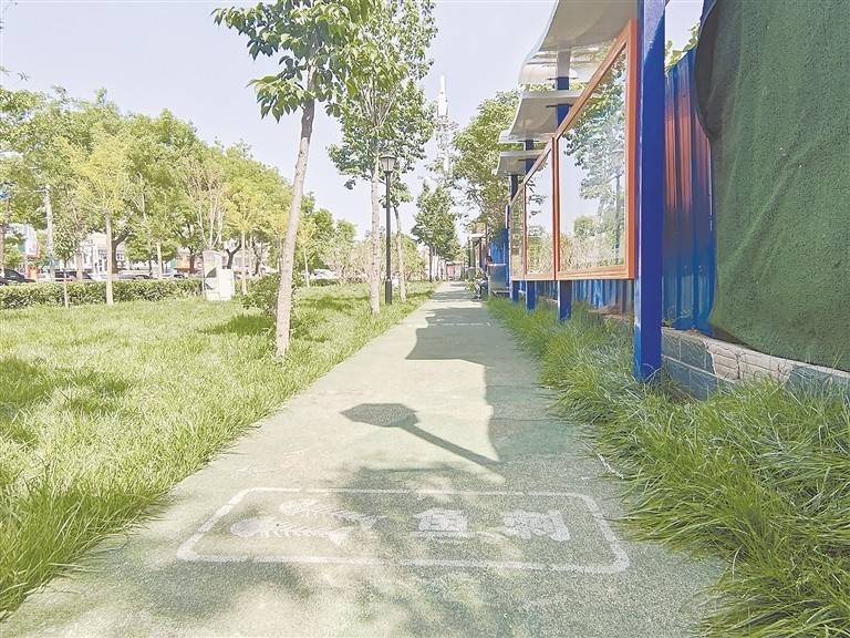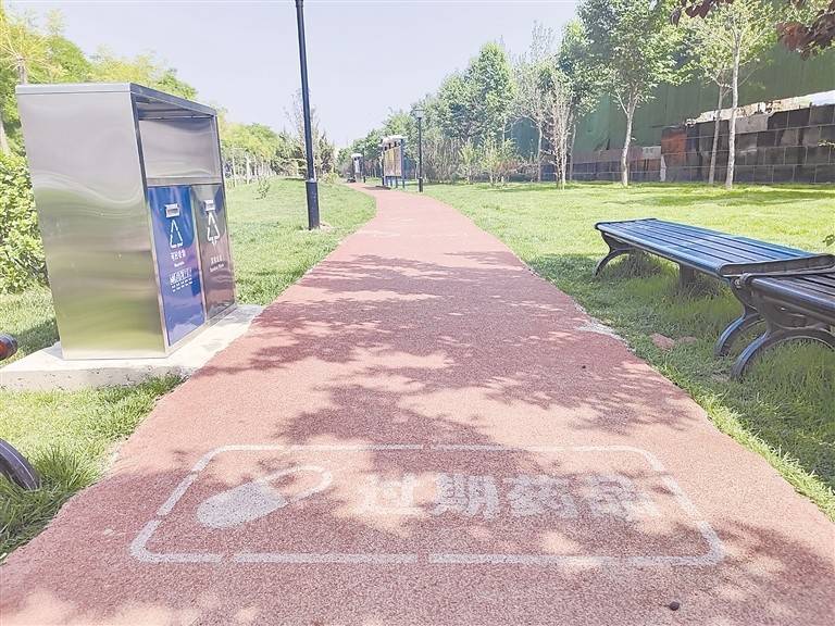 垃圾分类主题公园约6100平方米,在金色阳光的照耀下,国槐、紫叶李、大叶黄杨球、造型油松、金叶国槐等植物错落有致,低矮茂密的灌木,造型独特的乔木,深浅交织,满目皆绿,映出一片生机。公园东西贯穿整条街道,如一条绿色长廊,成为附近居民休闲运动的“宝藏场所”。漫步其中,记者看到,园内绿树成荫,设有长排座椅。散步游玩的多为老年人,他们或赏景攀谈,或坐下小憩,享受舒适清风。