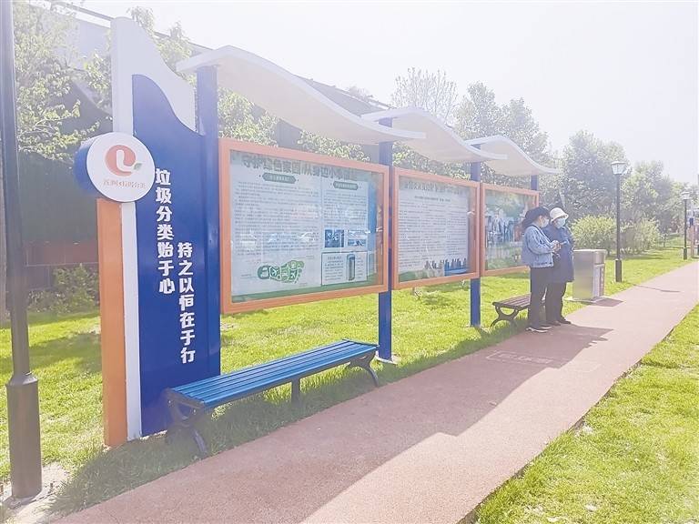 加装玻璃钢材质,做成垃圾分类标准的四色塑料袋;体现可回收物利用价值的金属材质雕塑;既遮阳又美观,还设有休息座椅的展示牌……作为垃圾分类主题公园,园内设施几乎都与垃圾分类密切相关。草坪上设有各种垃圾分类主题艺术雕塑、展架,造型独特,与周围绿植融为一体,成为公园的点睛之笔。让居民在体验风景、强身健体、休闲娱乐同时,通过不同的方式学习了解垃圾分类环保知识。