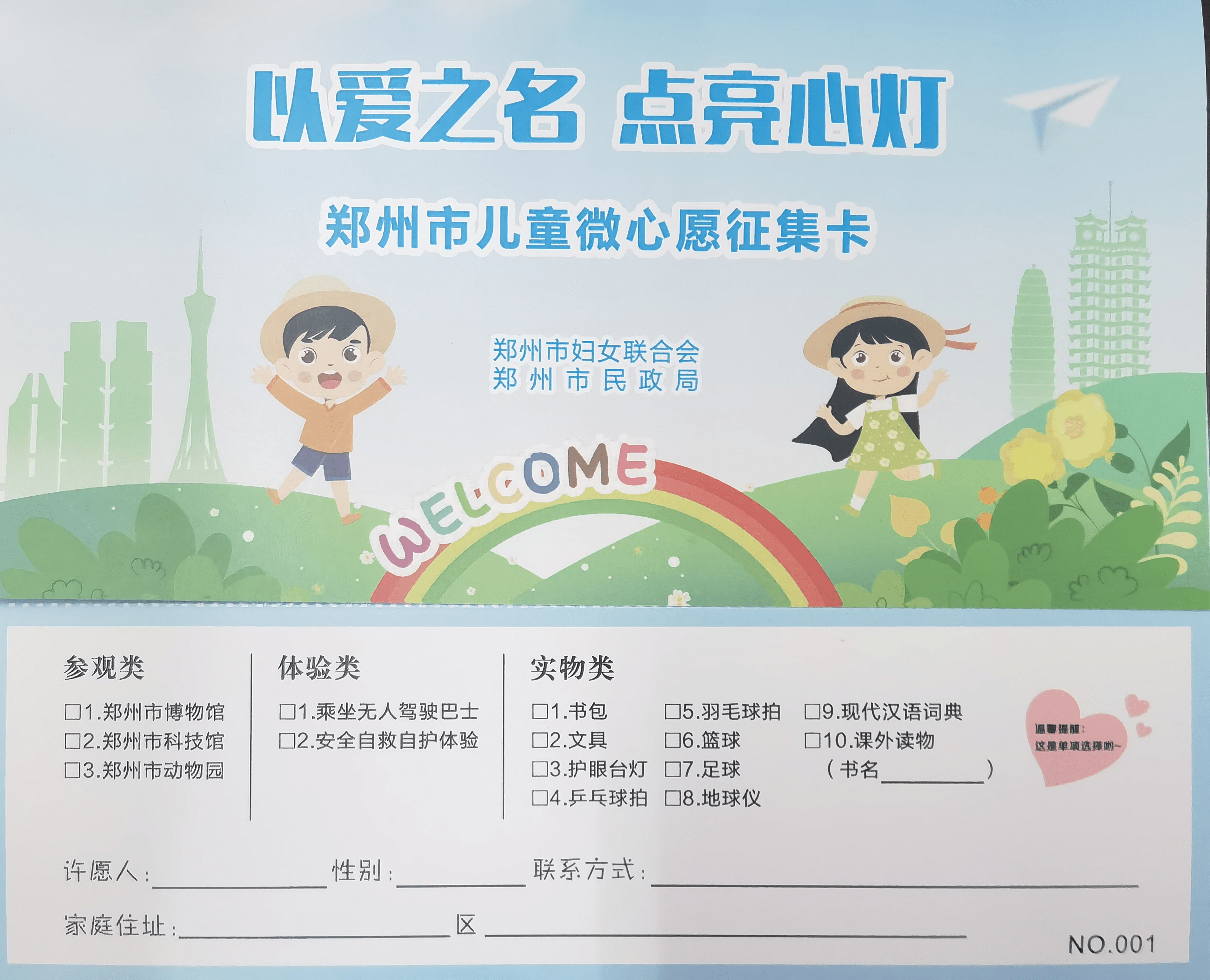 这是一次爱心善行,这是一次圆梦之旅。在“六一”国际儿童节即将来临之际,为提升全市事实无人抚养儿童的幸福感和获得感,郑州市妇联、市民政局联合启动“以爱之名 点亮心灯”儿童微心愿圆梦活动。