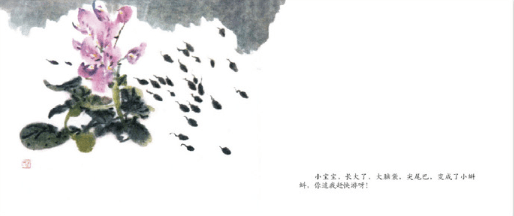 ✦ 同时,它也是一本“关于爱”的图画书。表现出小蝌蚪对妈妈的依恋,对孩子来说,母爱不可或缺。法国《世界报》曾对这个故事的动画片评论道:“中国水墨画,画面景色柔和,笔调细致,表示忧虑、犹豫和快乐的动作,使这部影片产生了魅力和诗意。”
