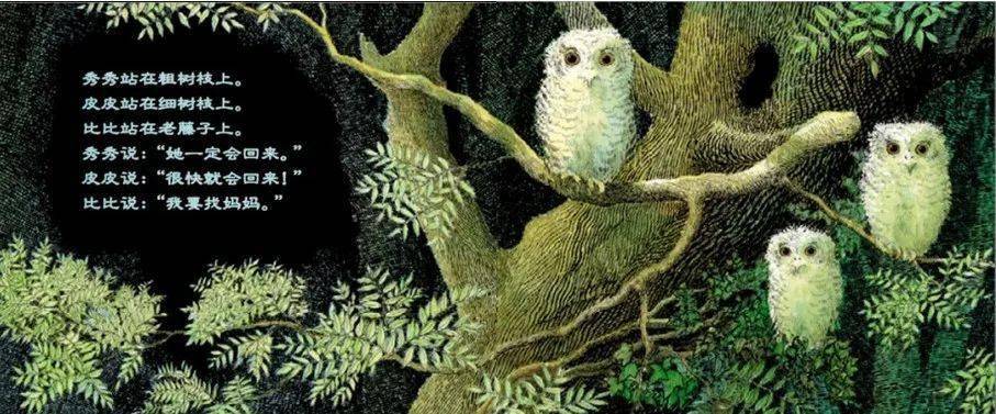 ✦ 三只小猫头鹰——秀秀、皮皮和比比在黑夜中等妈妈回家,他们待在温暖的树洞中,因为牵挂,因为担心,也因为思念,他们慢慢走到树洞外面等待。森林是如此的黑,让秀秀、皮皮和比比互相依偎在一起,并且闭上双眼,祈求妈妈快快回家。
