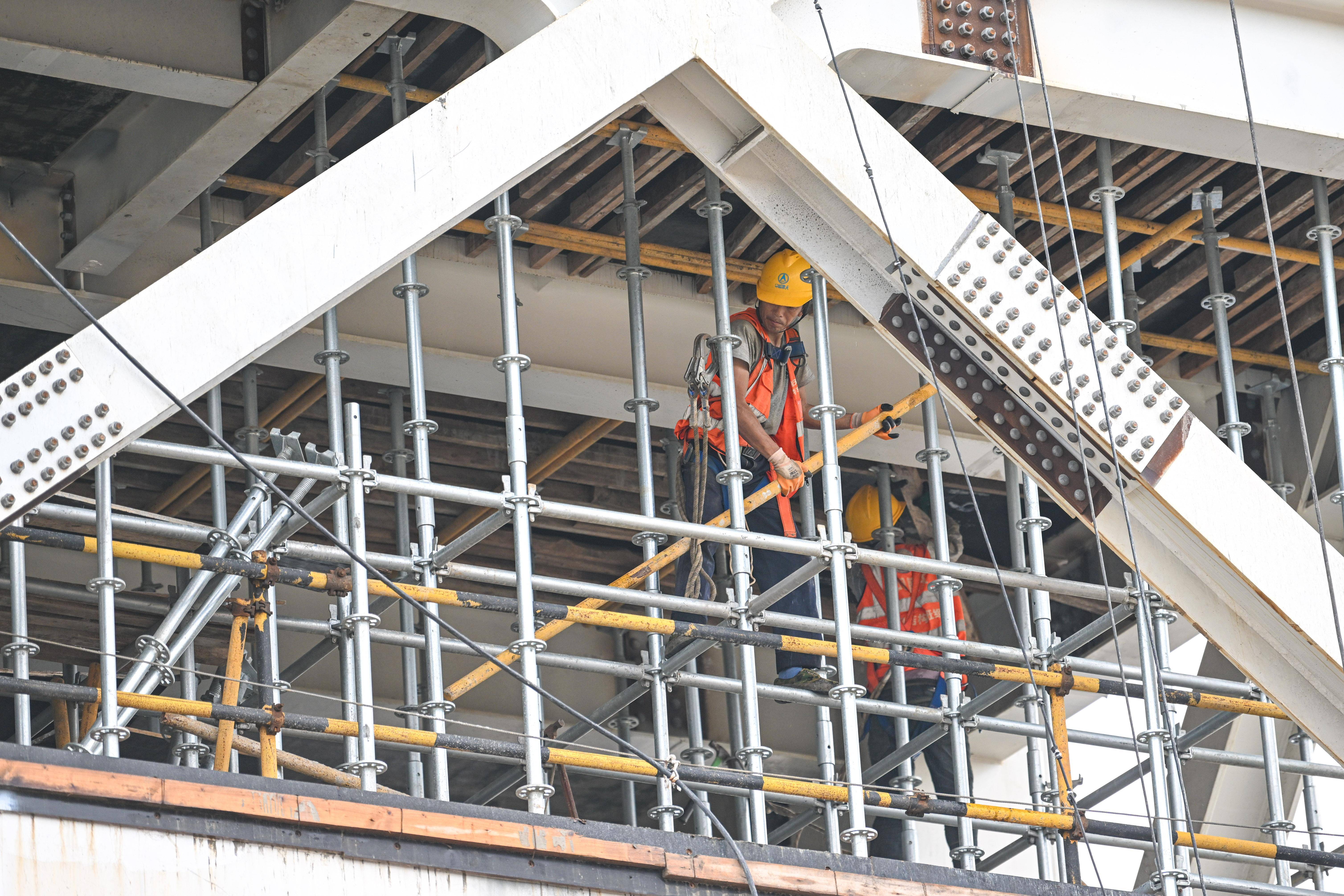 5月13日,工人在位于海南省文昌市的海南商业航天发射场1号工位施工。 新华社记者 蒲晓旭 摄