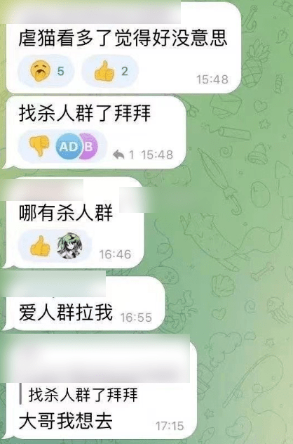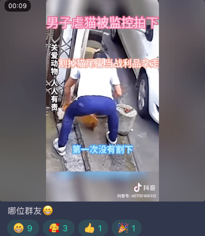 跟倒卖视频的一样的,自制虐猫视频的群也很难找,而且找到以后,想要真打入,也有层层验证。