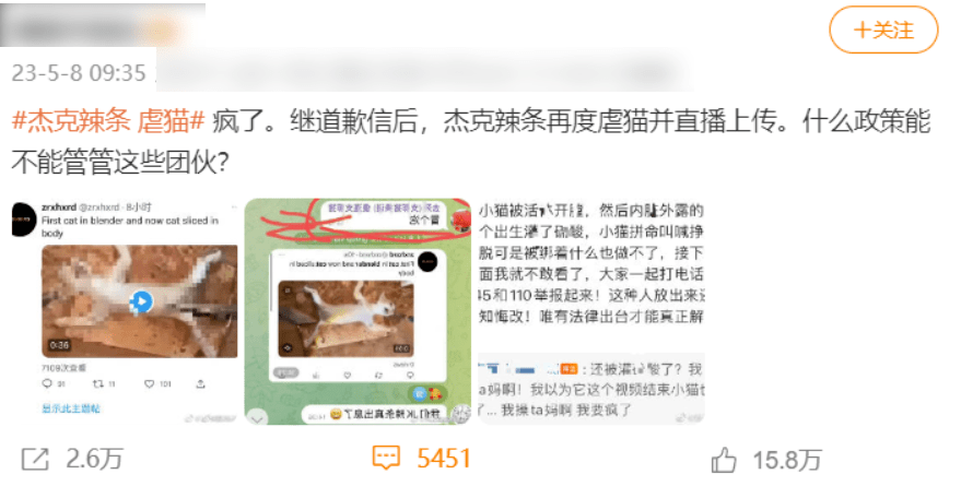 但前几天,我又刷到了一则消息:杰克辣条再度虐猫并且还开直播。