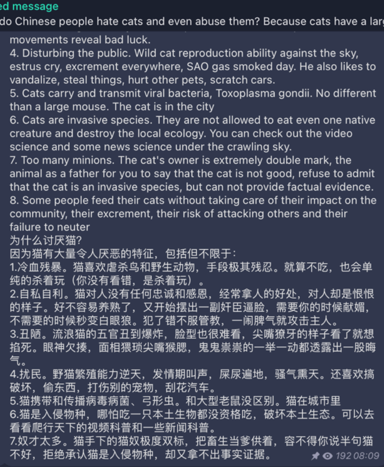 但虐猫这事上,也有鄙视链,自制虐猫视频的看不起这些拿虐猫去盈利的,用他们的用词来说,这群转卖视频的人充其量是 “ 文化输出 ” 的出口。