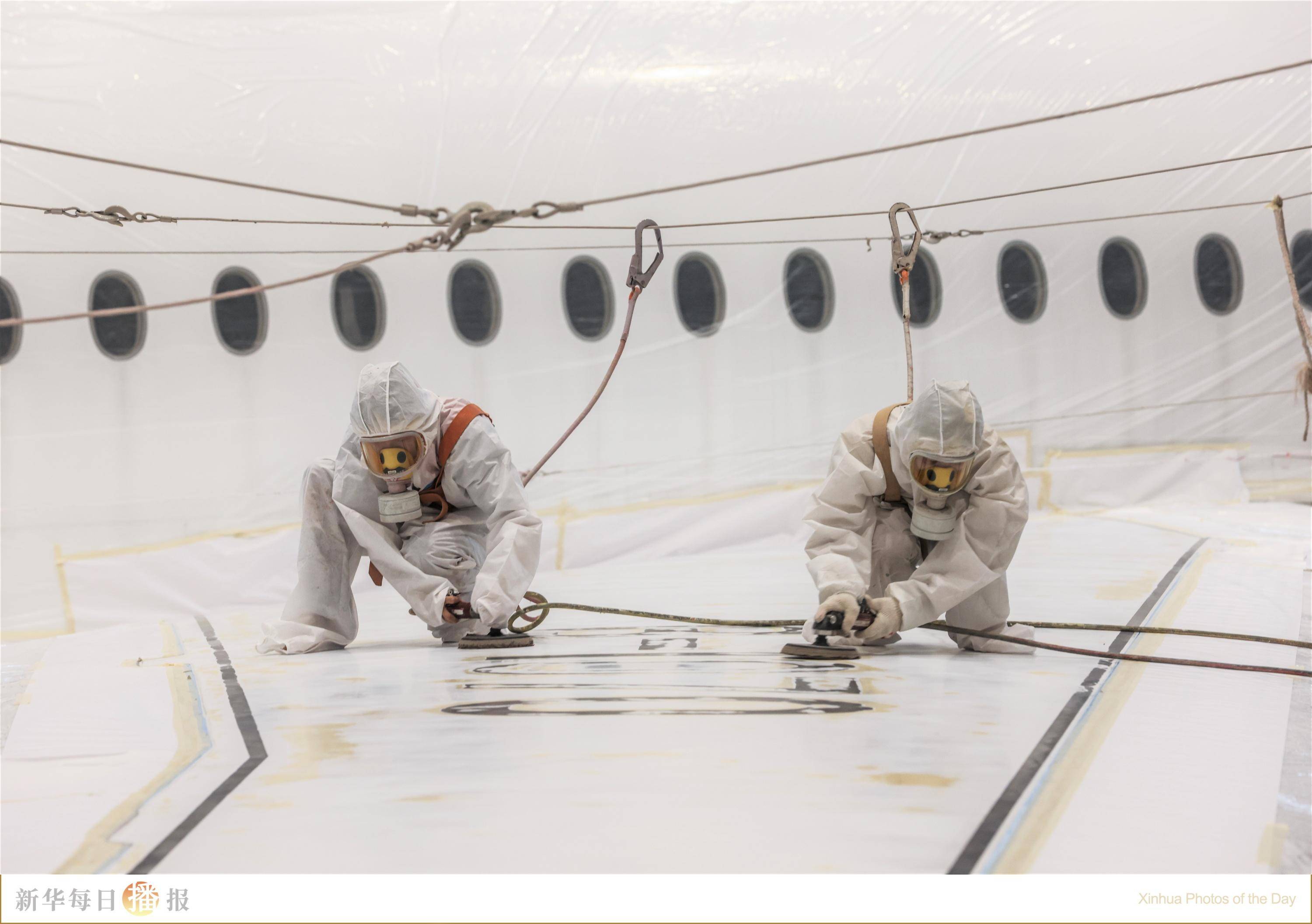 5月11日,在海南自贸港一站式飞机维修产业基地内,喷涂作业员对一架空客A350-900宽体客机进行喷漆打磨工作。完成整机喷涂后,这架飞机将从海口美兰国际机场飞往西班牙首都马德里完成交付。据悉,这是海南自贸港一站式飞机维修产业基地投产以来承接的首单空客A350机型飞机整机喷涂业务。