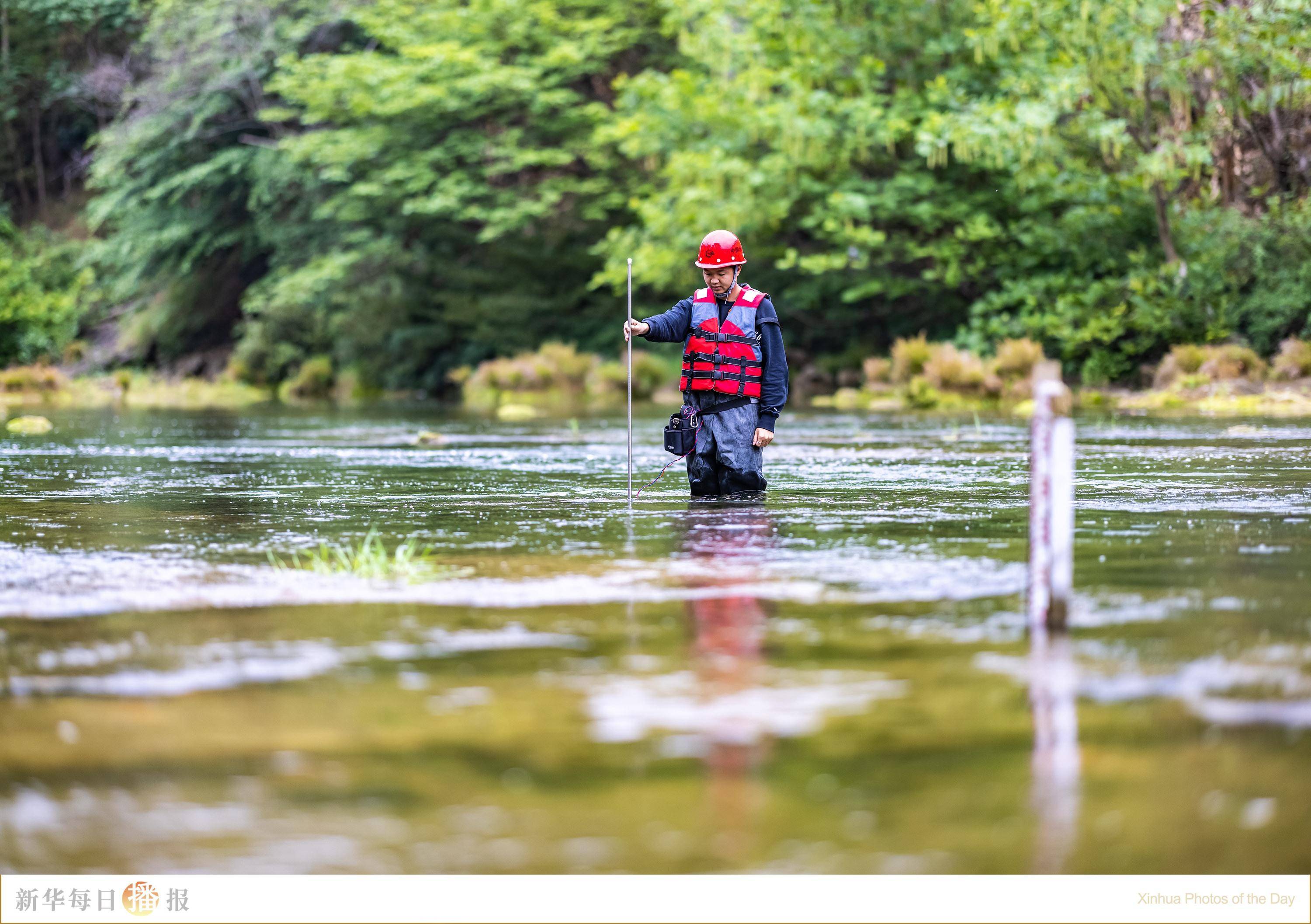 5月10日,水文工作人员在贵州省黄果树水文监测站开展低水流量涉水施测工作。黄果树水文监测站始建于1982年,位于贵州省安顺市黄果树瀑布景区上游。每年5月至10月,黄果树水文监测站所处的珠江流域北盘江左岸一级支流打邦河进入汛期。在汛期,水文站的工作人员尤为忙碌。他们担负着防汛减灾的任务,需要做好洪峰监测、洪水分析以及预报信息发布等工作,保障沿岸人民生命财产安全。40余年来,一代代水文人驻守深山水文站,“把脉”江河,默默坚守和付出。