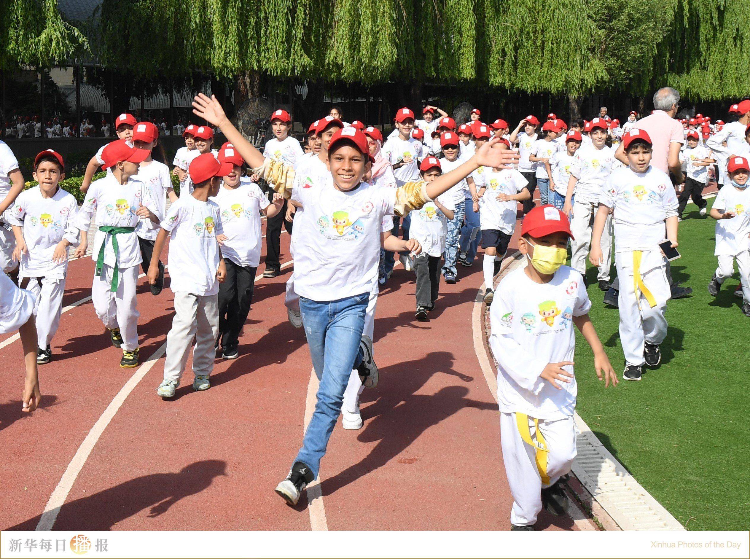5月11日,在伊朗首都德黑兰,小朋友们在参加“迎杭州亚运会趣味跑”伊朗站活动。当日,“迎杭州亚运会趣味跑”伊朗站活动在伊朗首都德黑兰伊朗国家奥林匹克学院举行。