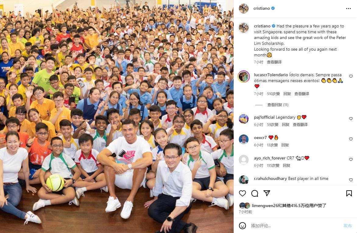 照片中的C罗和学生们一起坐在地上,十分亲切。C罗还写道:“几年前曾有幸来到新加坡,和这些了不起的孩子们共度时光,并且见证了PeterLim奖学金实现的伟大工作。期待下个月能再次见到你们所有人。”