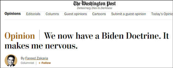 在这期节目播出前,扎卡里亚为《华盛顿邮报》外交事务专栏撰写的评论文章于当地时间5月5日发布,题为“我们现在有了‘拜登主义’(Biden doctrine),这让我很紧张”。