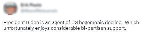 “拜登总统是美国霸权衰落的推动者。不幸的是,这得到了两党的大力支持。”