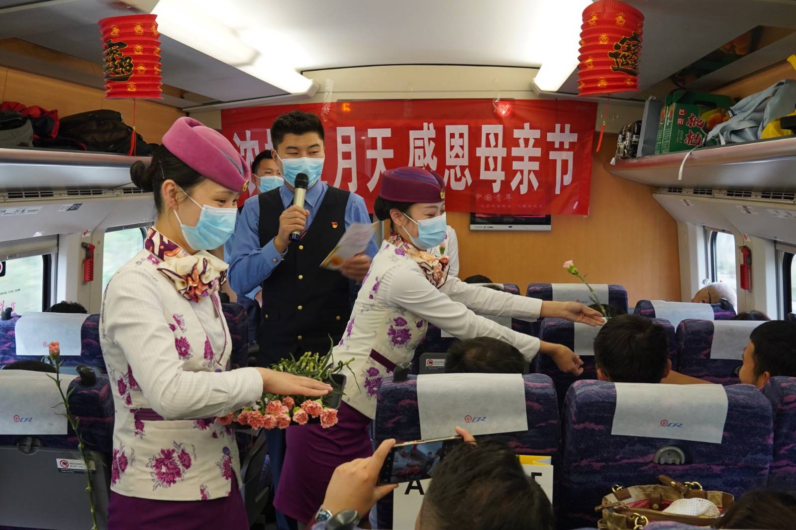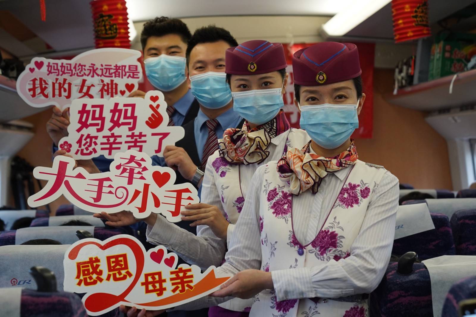 乘务员在车内为旅客送上母亲节的祝福
