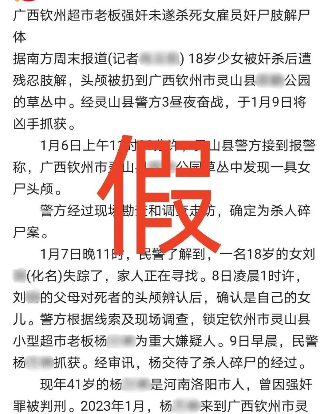 近日,广西钦州网警在工作中发现,有网民在今日头条上发文称:“18岁少女被杀害后惨遭奸尸并被肢解,头颅被扔到钦州市灵山县某公园的草丛中……目前凶手被抓获”。