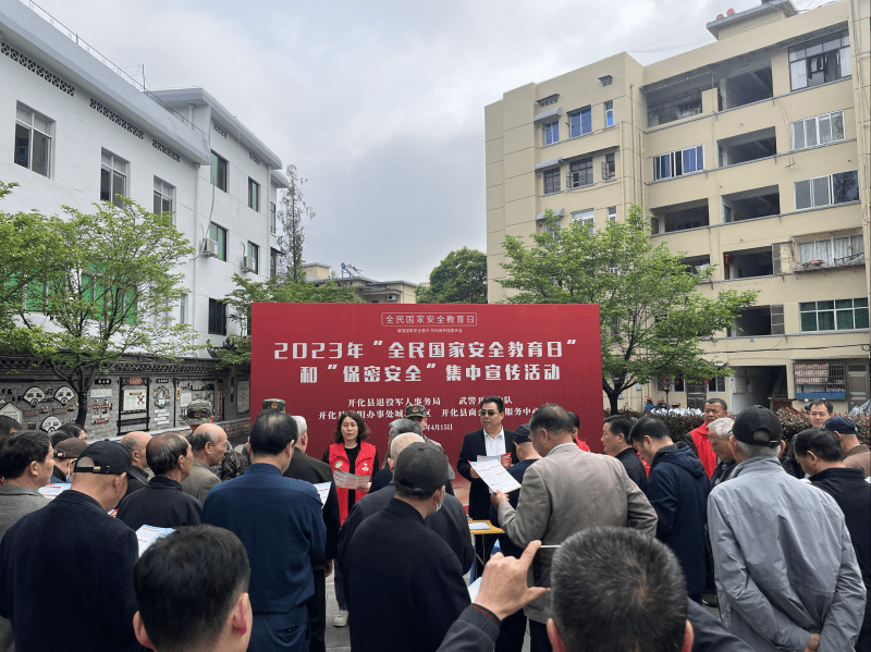 4月15日上午,城北社区联合开化县退役军人事务局、武警开化中队、开化县商企义工服务中心在钟山广场开展2023年“全民国家安全教育日”和“保密安全”宣传活动。