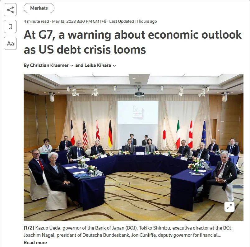综合路透社和澳新社报道,在美国债务危机和俄乌冲突的阴影下,七国集团(G7)财长当地时间13日结束了为期三天的会议。会后发布的联合公报没有直接提及美国债务违约风险,但提出明确警告,全球经济不确定性加剧的情况下,要保持警惕。