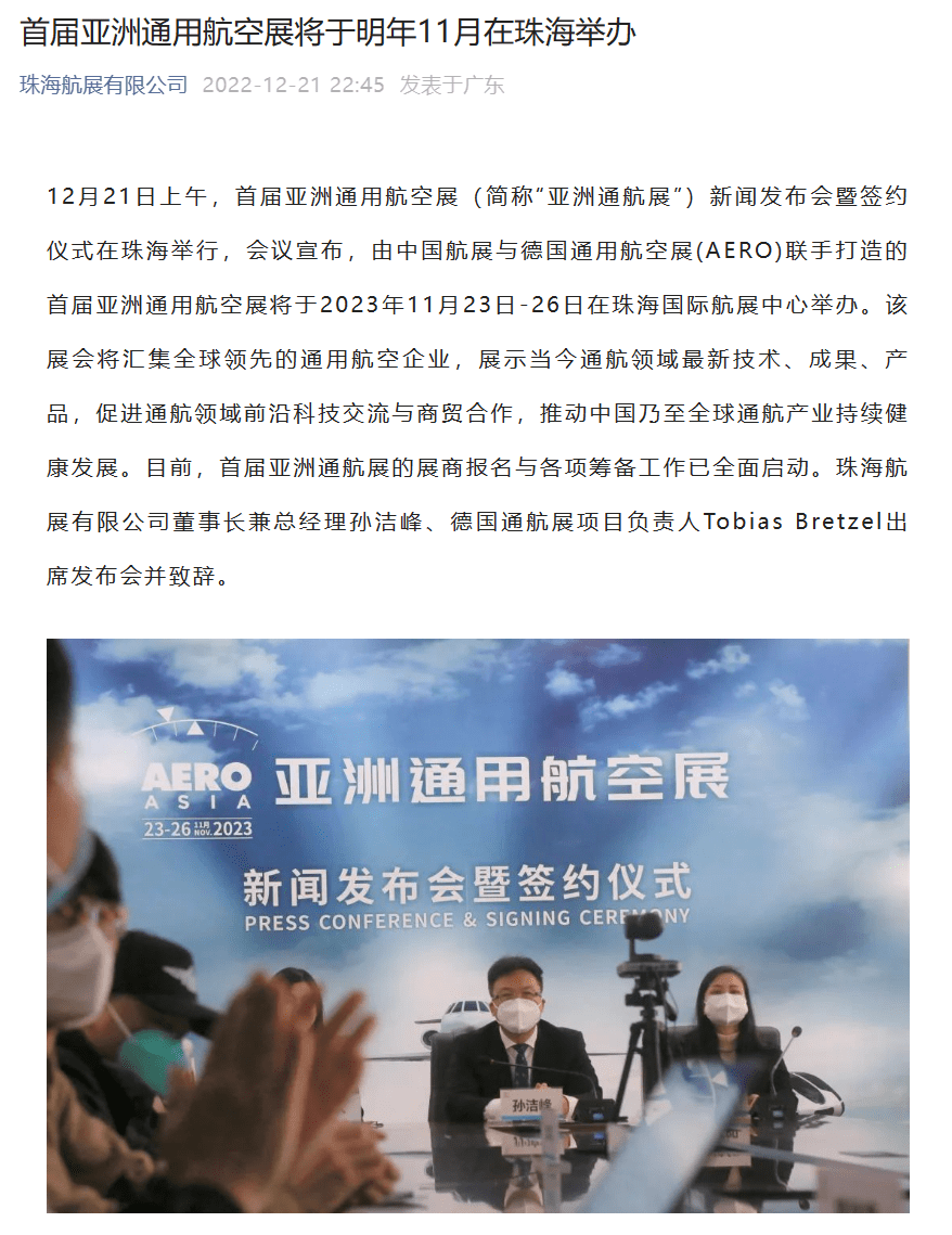 商务部印发《商务部关于同意举办亚洲通用航空展的批复》(商服贸批〔2023〕129 号),明确同意由珠海航展集团有限公司与德国腓特烈斯哈芬展览有限公司于 2023 年 11 月 23 日到 26 日在珠海国际航展中心共同举办亚洲通用航空展(AERO ASIA)。2023 亚洲通用航空展正式成为中国唯一经商务部批准、由中德合作举办的通用航空类专业展会。