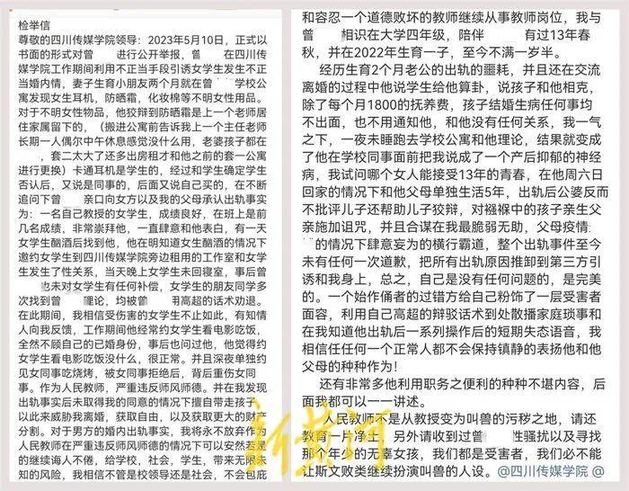 5月13日,发文的张女士称,她与曾某超结婚多年并育有一子。自己生育两个月之后,在曾某超所住的学校公寓中发现女士耳机、防晒霜、化妆棉等女性物品,在不断追问之下 得知其出轨学生的事实。曾某超此后在未取得自己同意的情况下 擅自带走孩子,以此来威胁离婚,获取自由。