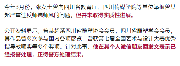 张女士透露,她在网上公开举报信后,收到了很多私信,有几位女生私信表示, 她们之前也曾受到曾某超的性骚扰,并在被诱骗情况下与对方发生关系,并且提供了微信对话等证据, 以此证明其确有引诱女学生等违反师德师风的行为。