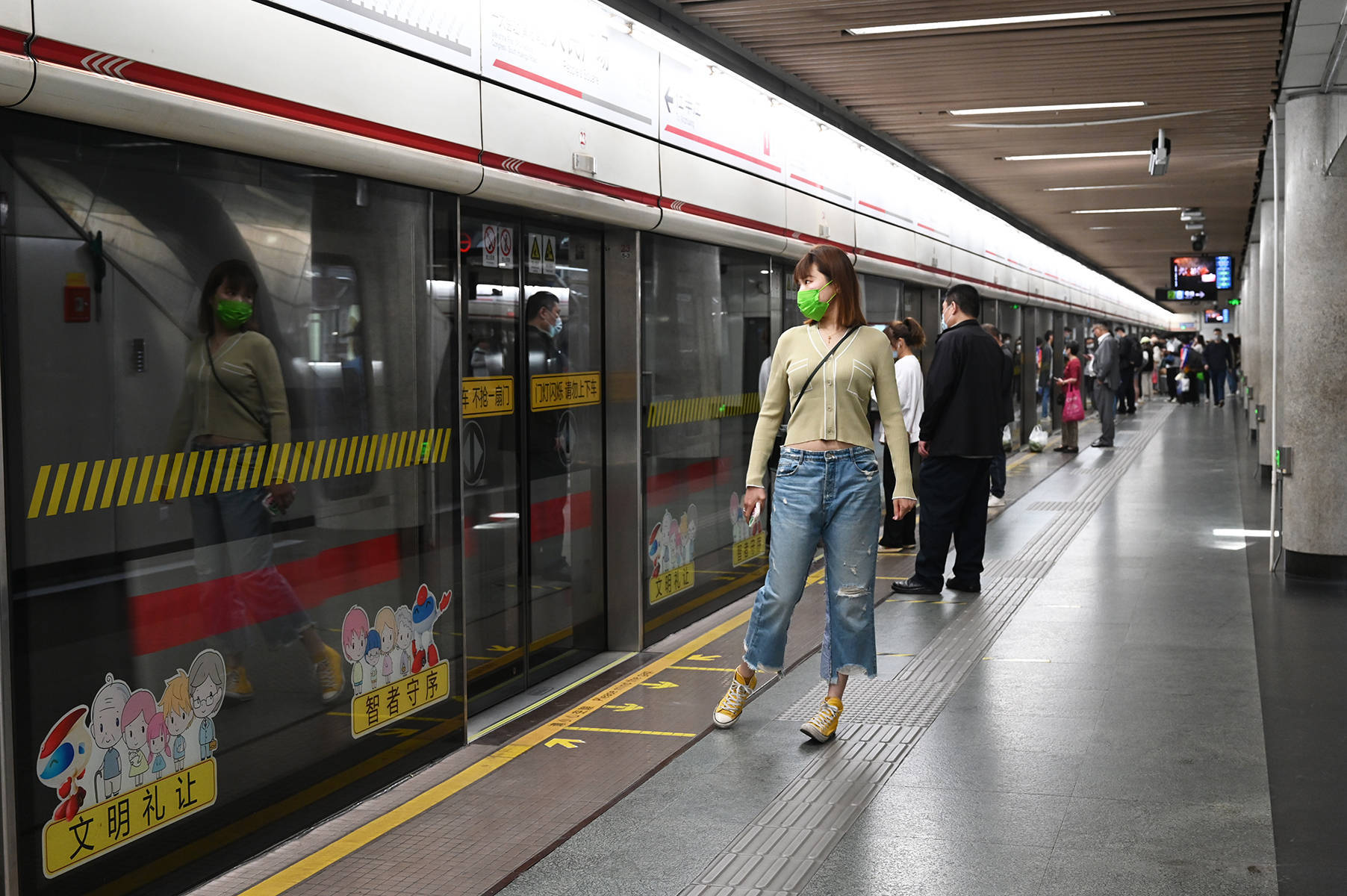 2023年5月25日,上海,地铁人民广场站。一女子凭借站台玻璃的反光整理仪表。澎湃新闻记者 吴栋 图