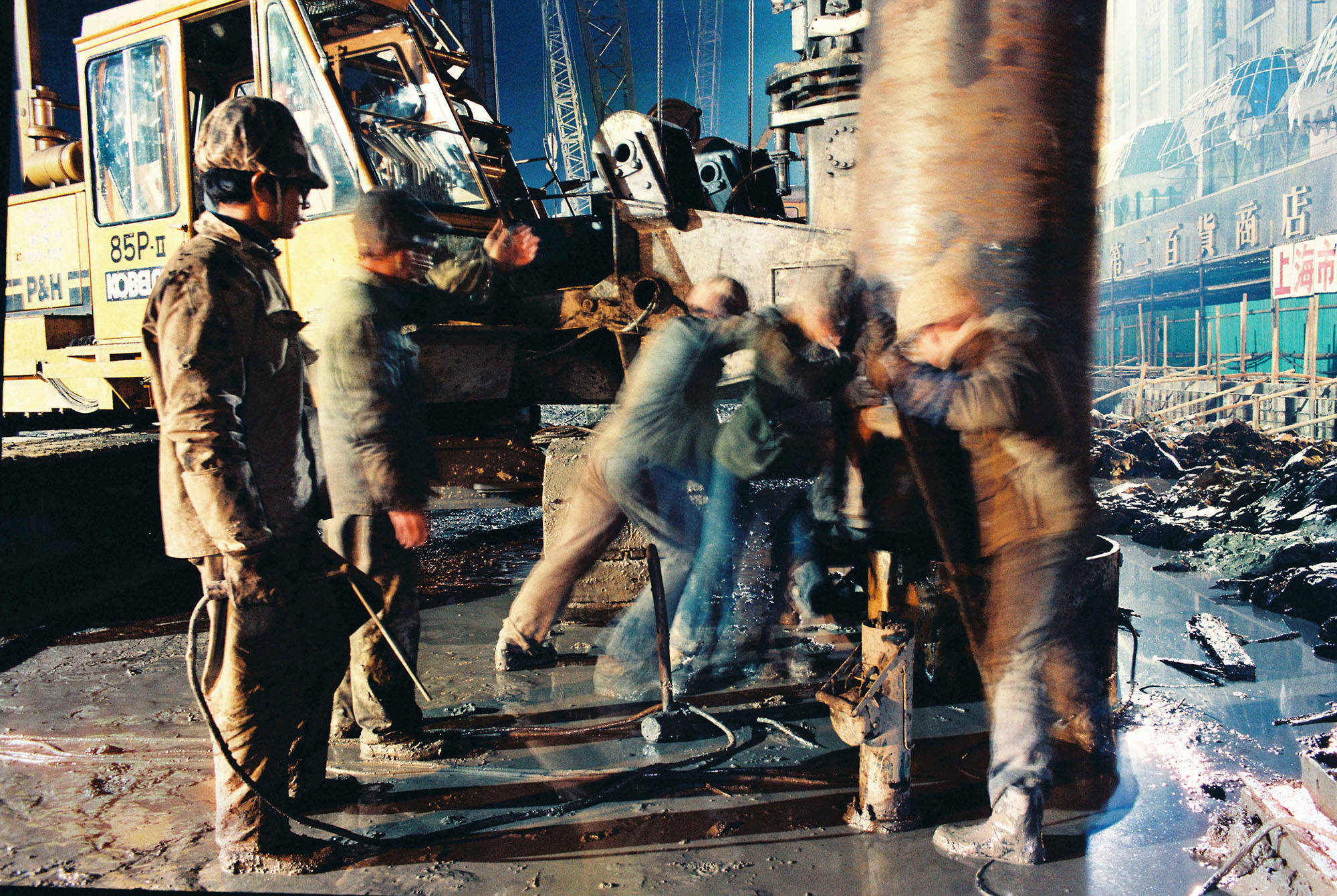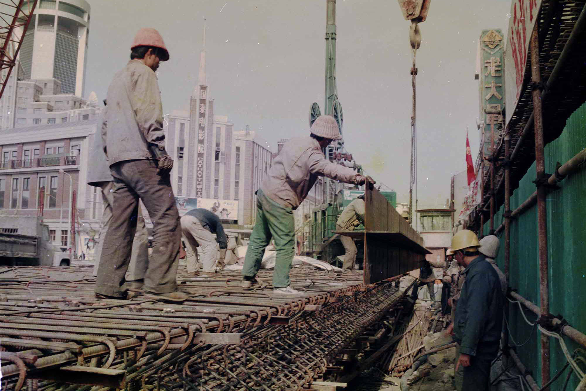 1992年,上海,淮海中路。工人们正在挖路,用于修建地铁(今陕西南路站附近)。陆杰 图