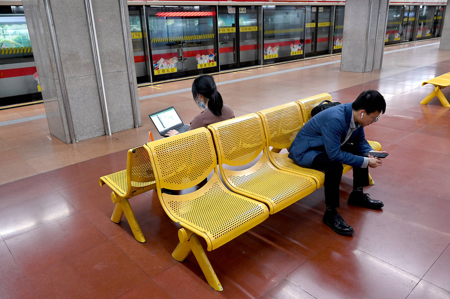 2023年5月25日,上海,地铁上海火车站站。一位正用手提电脑工作的女子与一位等车的男子。澎湃新闻记者 吴栋 图