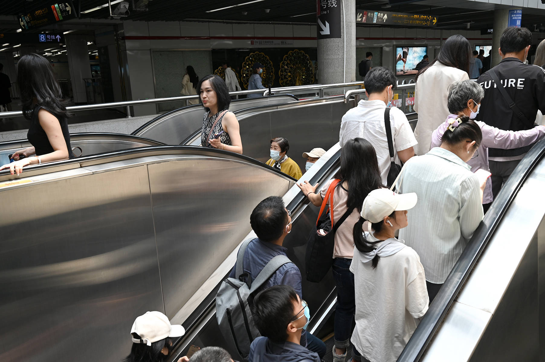 2023年5月25日,上海,地铁人民广场站。上下自动扶梯的乘客。澎湃新闻记者 吴栋 图