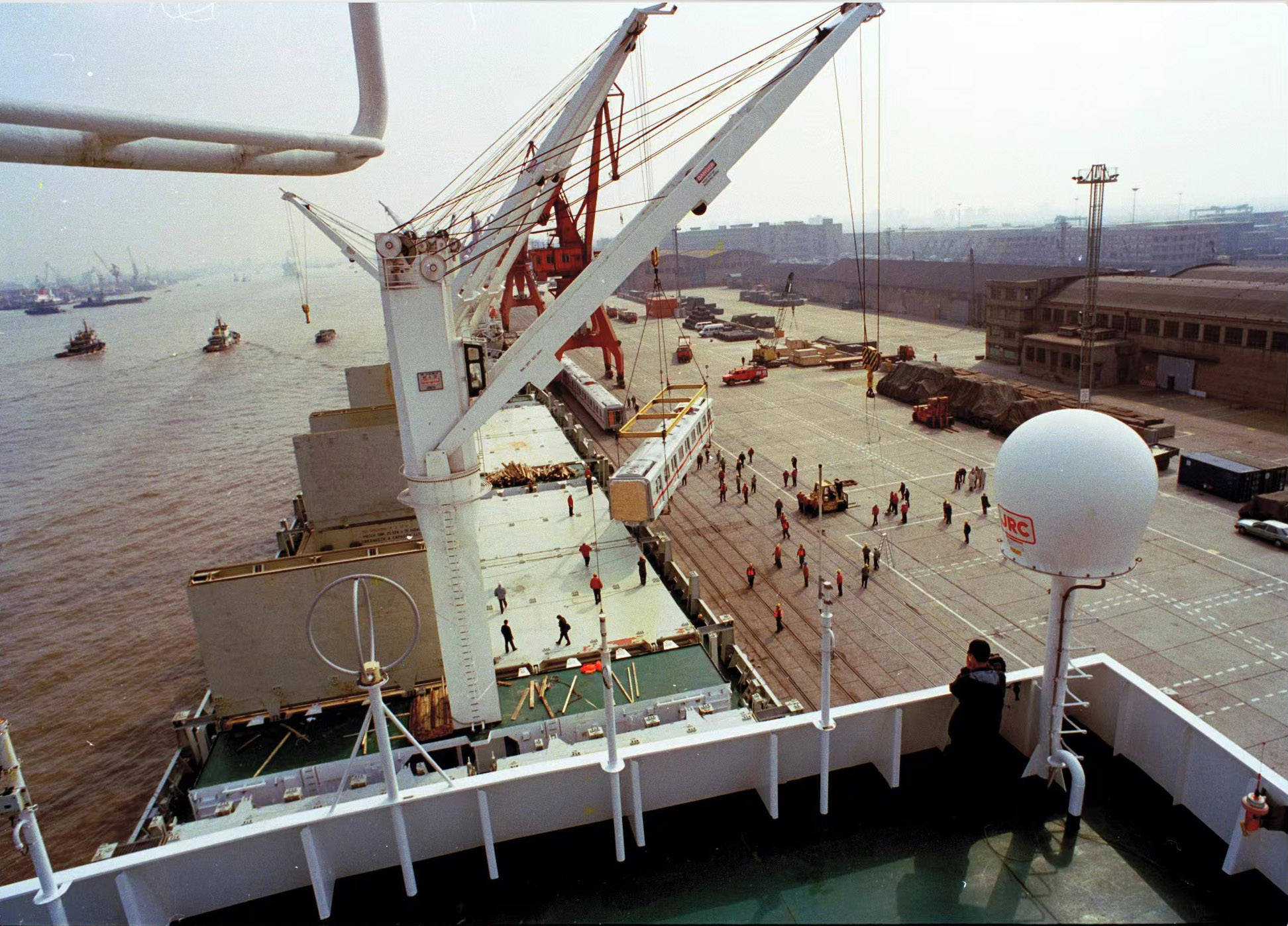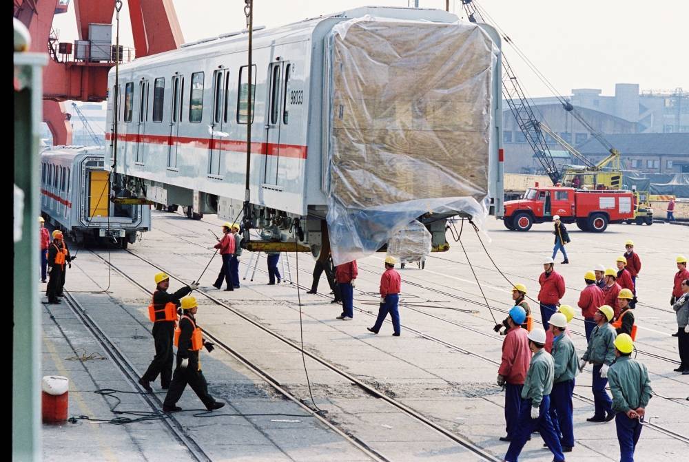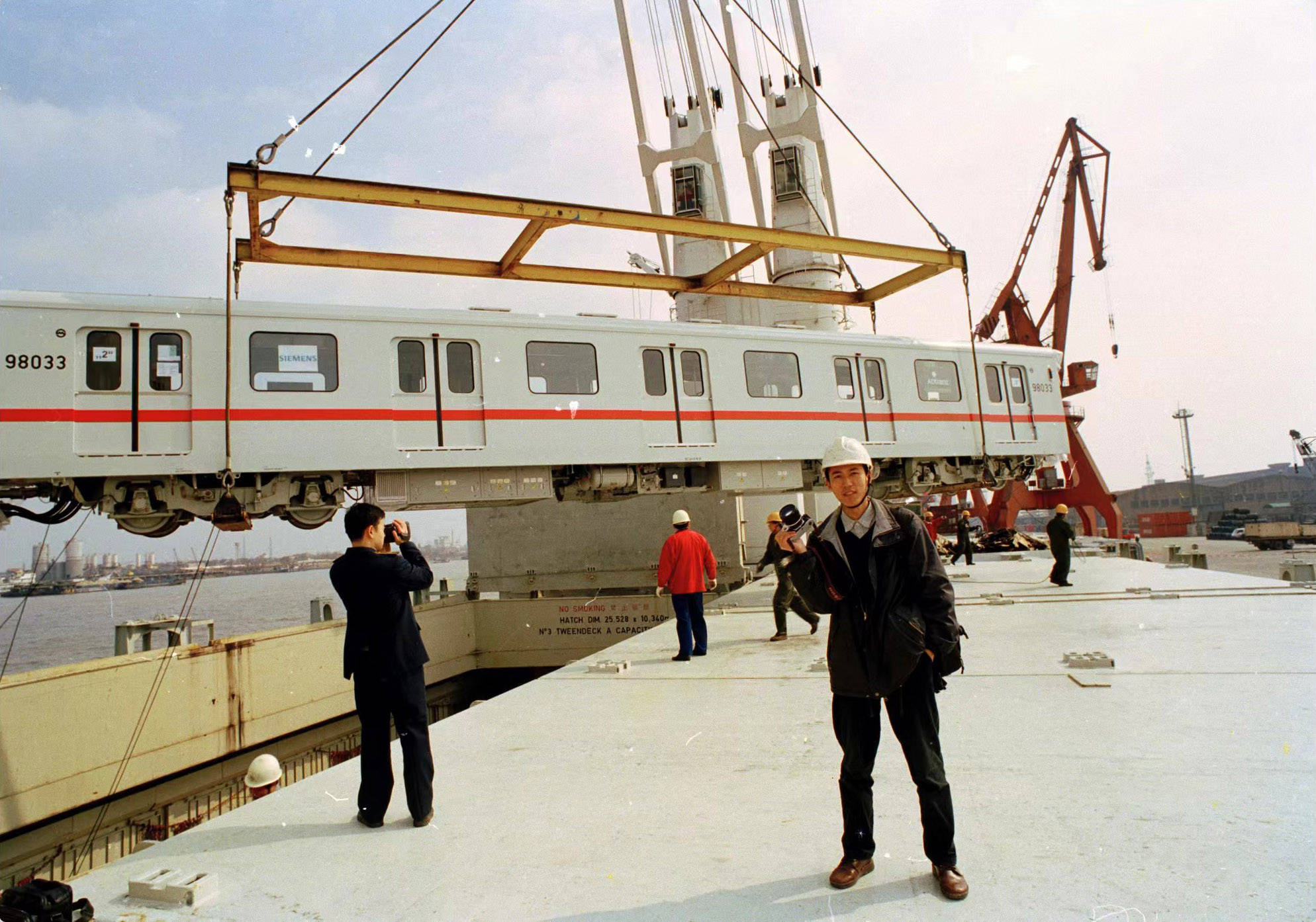 1999年9月,上海,军工路码头。从德国运送至上海的地铁车厢从“泰兴”轮上卸下。陆杰 图