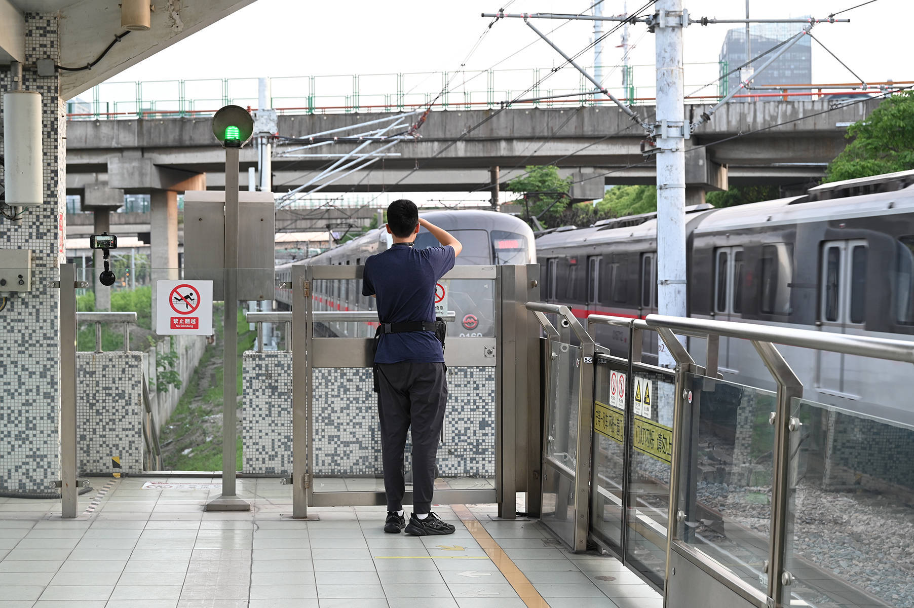 2023年5月25日,上海。一号线外环路站内,15岁的李翼雄在每辆列车经过时拍照。澎湃新闻记者 吴栋 图