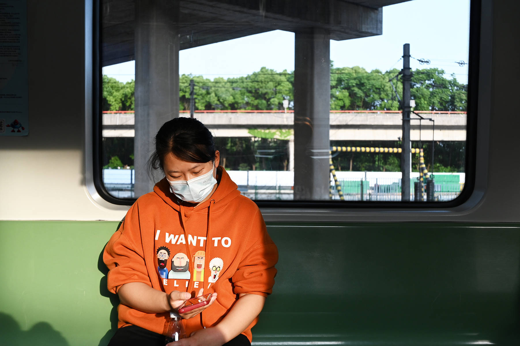 2023年5月25日,上海。地铁一号线车厢里,一名女子正看着手机,阳光洒在地铁里。澎湃新闻记者 吴栋 图