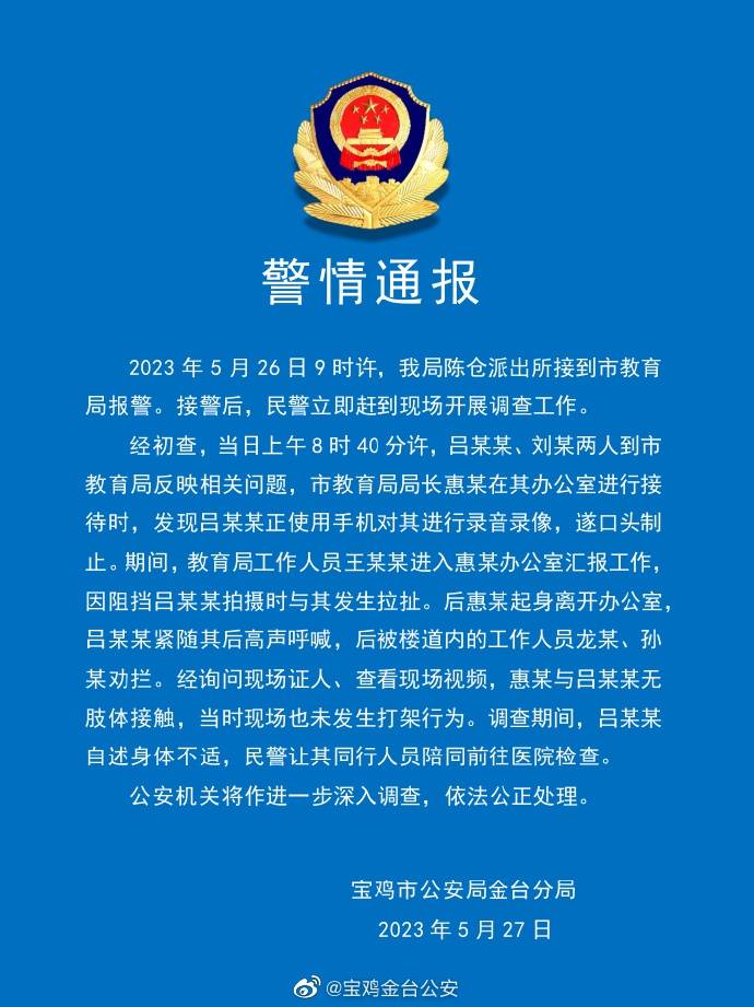 宝鸡市公安局金台分局5月27日晚发布警情通报,2023年5月26日9时许,我局陈仓派出所接到市教育局报警。接警后,民警立即赶到现场开展调查工作。