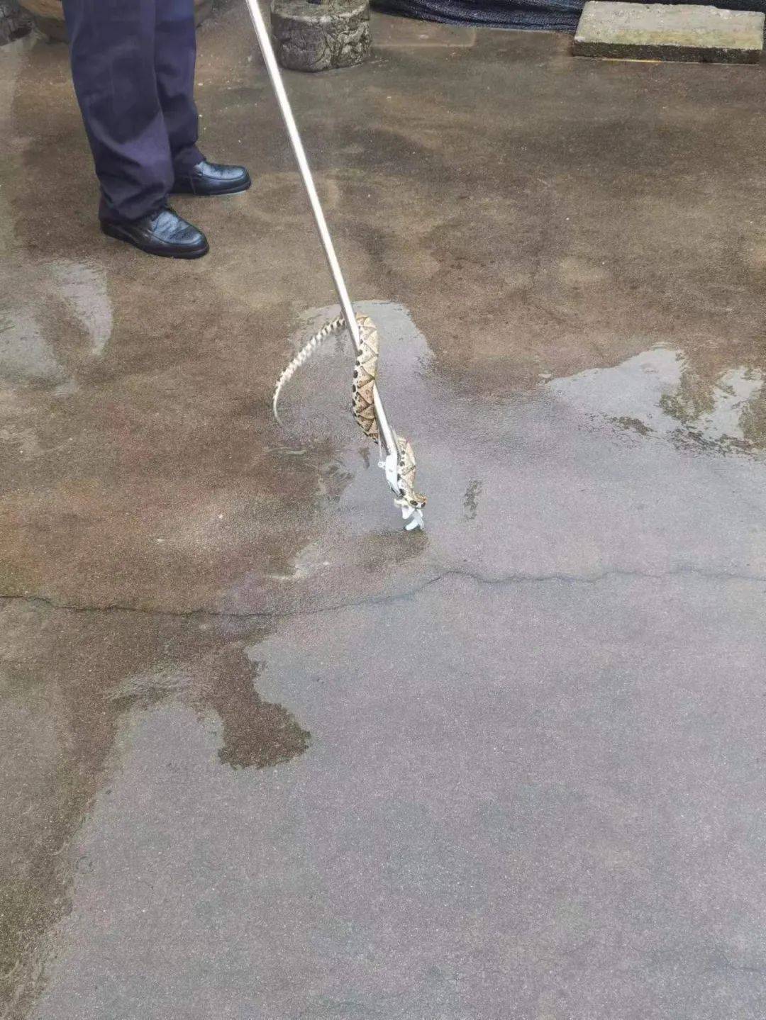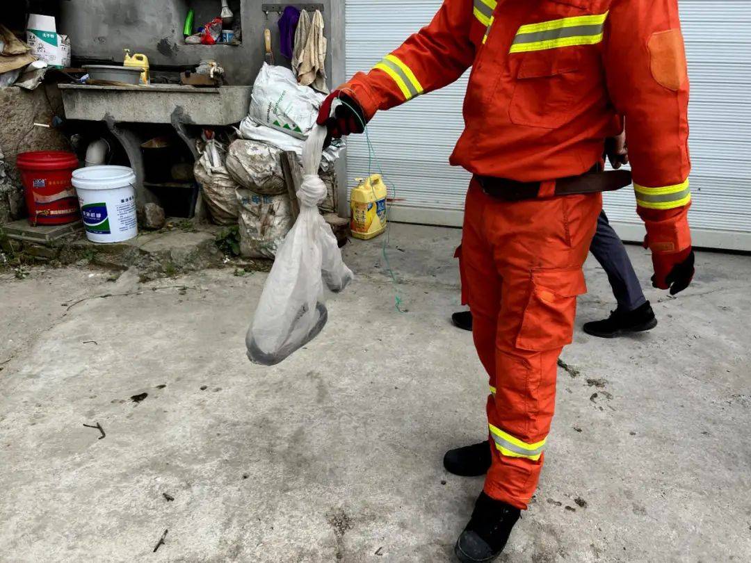 同日,鄞州塘溪派出所接到群众报警称,在自家院子内发现一条蛇,民警史晨赶赴现场。考虑到附近住户较多,史晨封闭现场后,快速用火钳夹住蛇的头部,将其装入编织袋中。