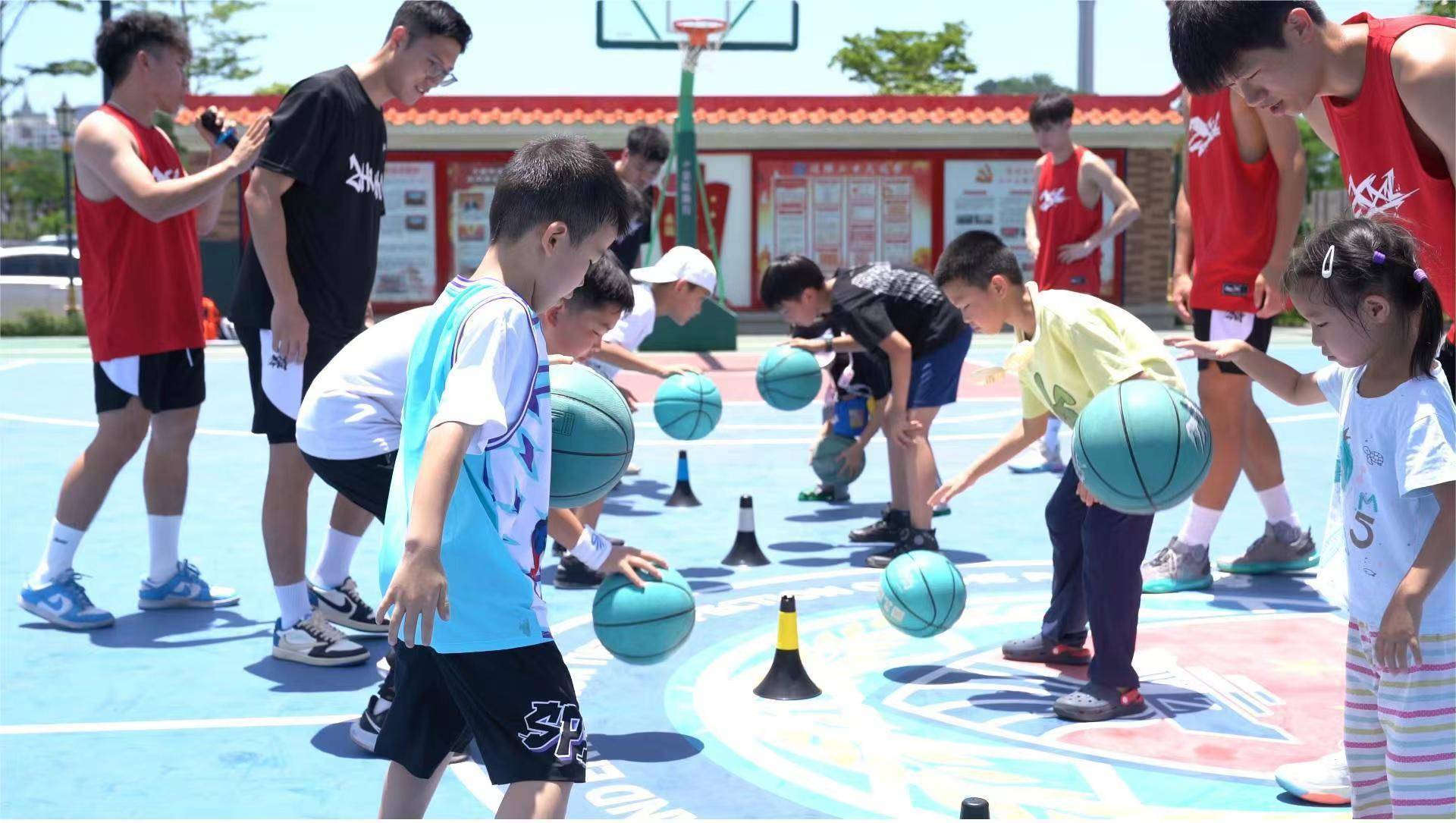 小朋友们的话音刚落,营区的广播便响起了热烈动感的音乐,8个身着篮球服的专业篮球教练熟练的运球跑入篮球场,为了给警宝们更轻松愉快的活动体验,该站专门邀请到当地专业篮球培训机构的运动员和教练到场,为小朋友们开展篮球基础教学及开展球类趣味互动游戏,在教学中小朋友们兴致勃勃的跟着教练作出一个个运球动作,在游戏中挥汗球场、尽情欢笑,感受运动的快乐。