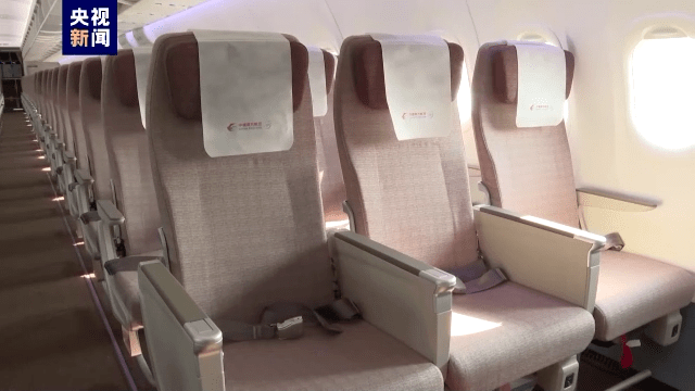 机舱内选用完全自主研发的 新一代国产客舱座椅。其中,8个公务舱座椅采用摇篮式设计,后靠可达120度,前后座椅间距超过1米,156个经济舱设计采用3-3布局,中间座位比两边座位宽1.5cm,加上客舱拥有2.25米的过道高度,旅客能感受到舒适的顶部和前方视觉空间。