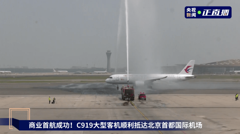 C919大型客机顺利抵达北京首都国际机场,并穿过象征民航最高礼仪的“水门”。
