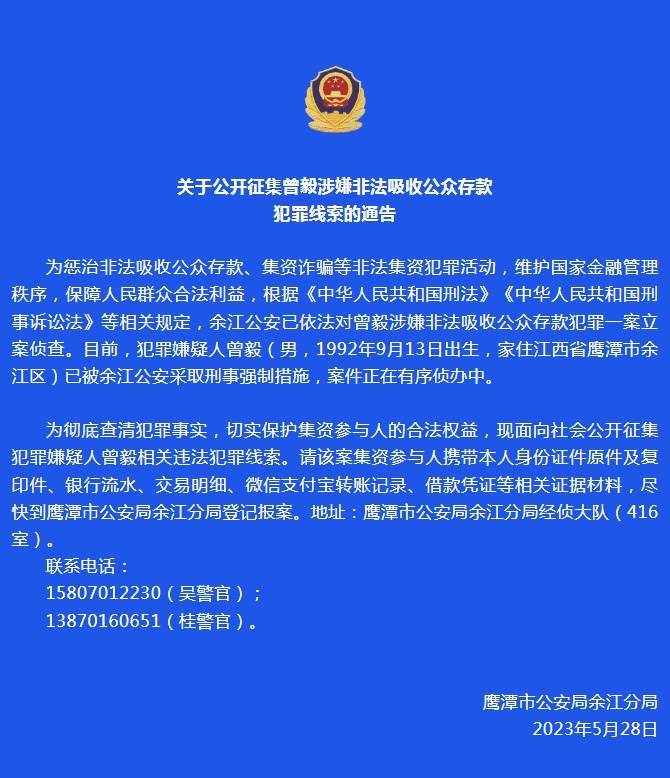 5月28日,据江西公安:关于公开征集曾毅涉嫌非法吸收公众存款犯罪线索的通告