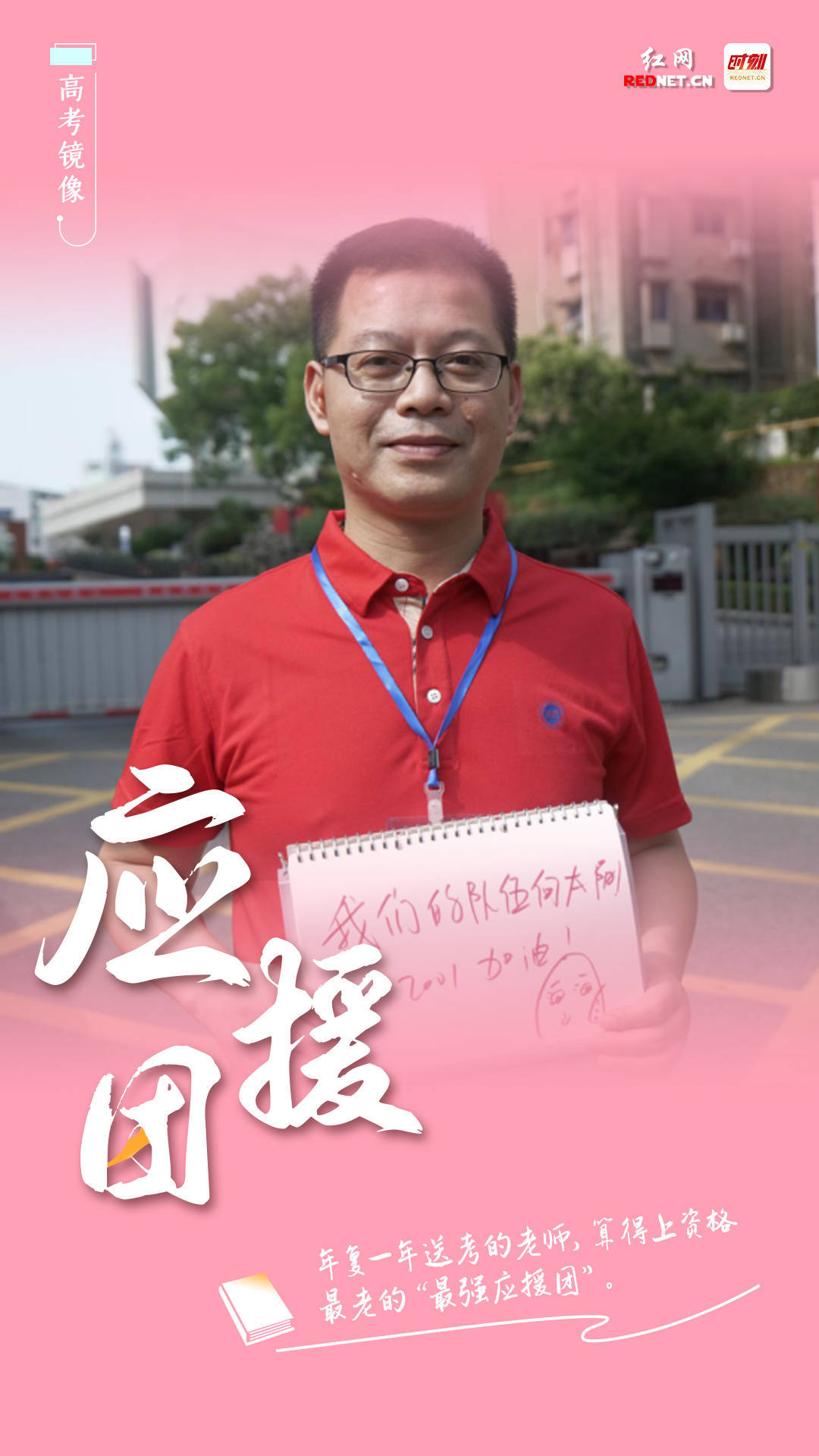 《我们的队伍向太阳》这是中国人民解放军军歌,阳光又很有力量,希望孩子们,也阳光又有力量。周延手持他的应援卡,卡片上可爱表情包里还隐藏着一个英语单词joy,“希望孩子们在快乐中学习,快乐中成长。”——长沙雅礼中学2001班班主任周涛