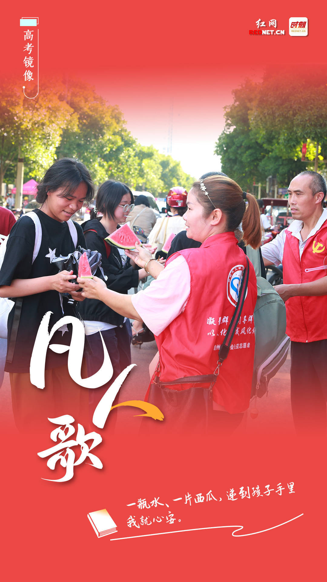 我今年39岁,是一名农民,也是一名出租车司机。2023年是我参加高考爱心送考活动的第十年,参加公司的志愿服务,传递爱心,虽然只是一瓶矿泉水、一片西瓜,看到高考的孩子们接过去,又兴冲冲地奔赴未来,我内心非常快乐。——靖州出租车女司机 吴才慧