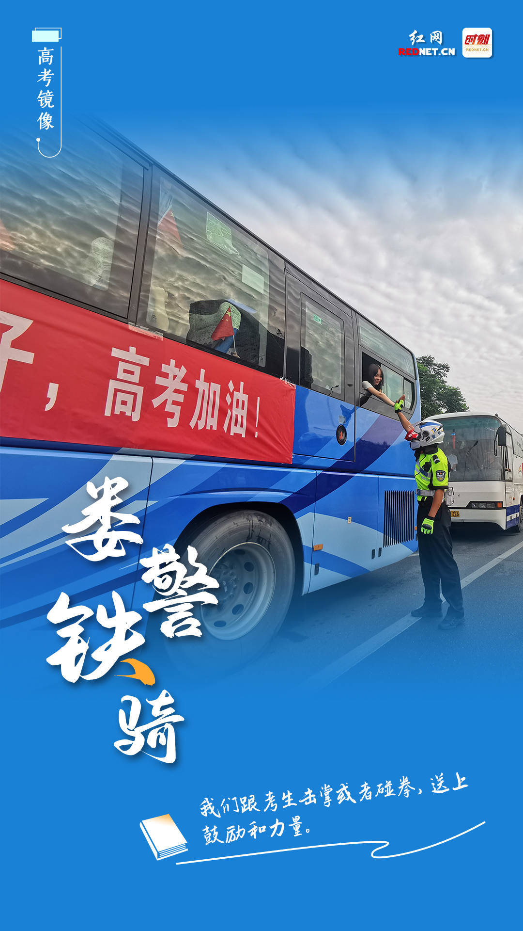 “在送考中,有学生会紧张,我们跟他击掌或者碰拳,送上鼓励和力量。”娄底交警铁骑胡锐有幸参加今年的送考,这些天,护送考试车辆的过程非常的顺利,看着考生从学校出发到考场,给考生加油鼓劲,自己特别自豪,“祝所有考生考试顺利,鱼跃龙门!”——娄底交警支队直属二大队铁骑胡锐