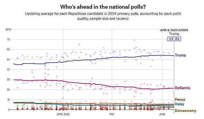 FiveThirtyEight综合多项民调的统计显示,从今年3月以来,特朗普与德桑蒂斯在共和党和亲共和党选民中的支持率差距一直在扩大。截至6月8日,特朗普的支持率保持在53.8%,德桑蒂斯为21.3%。