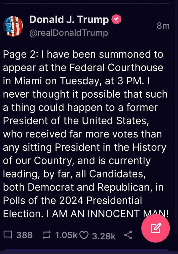 他暗指拜登政府搞政治迫害,指责拜登在卸任副总统之后还继续持有大量机密文件。特朗普透露自己被要求在当地时间下周二下午3点前往迈阿密联邦法院,并用大写字母强调自己“无辜”。