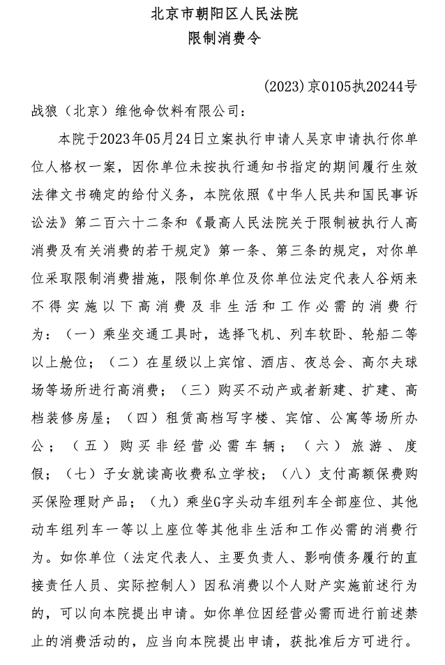 限制消费令内容显示,北京市朝阳区人民法院于2023年05月24日立案执行申请人吴京申请执行战狼饮料人格权一案,因战狼饮料未按执行通知书指定的期间履行生效法律文书确定的给付义务,该院依照相关规定对其采取限制消费措施,限制该单位及单位法定代表人谷炳来不得实施以下高消费及非生活和工作必需的消费行为。
