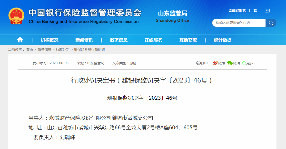 凤凰网山东(报料微博@凤凰网山东)日前获悉,6月5日,中国银行保险监督管理委员会山东监管局行政处罚显示,永诚财产保险股份有限公司潍坊市诸城支公司(以下简称:永诚财险诸城支公司),因存在编制、提供虚假的文件、资料的违法违规行为,被中国银保监会潍坊监管分局处罚款15万元。1名责任人同时被罚,处罚决定日期为2023年5月26日。