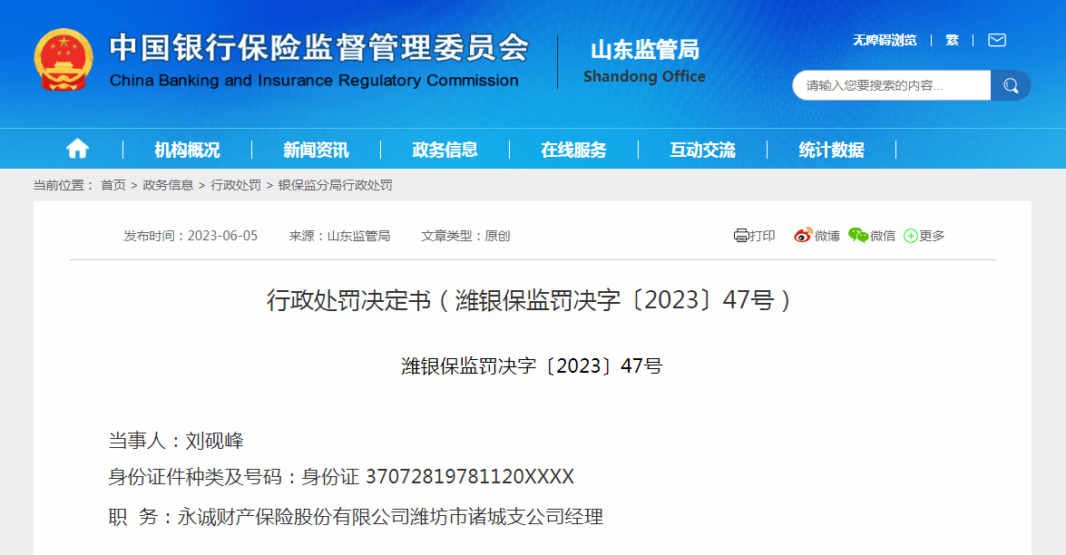 同时,行政处罚决定书(潍银保监罚决字〔2023〕47号)表明,时任永诚财险诸城支公司经理刘砚峰对永诚财险诸城支公司编制、提供虚假的文件、资料的违法违规行为负直接管理责任,被警告并处罚款2万元。