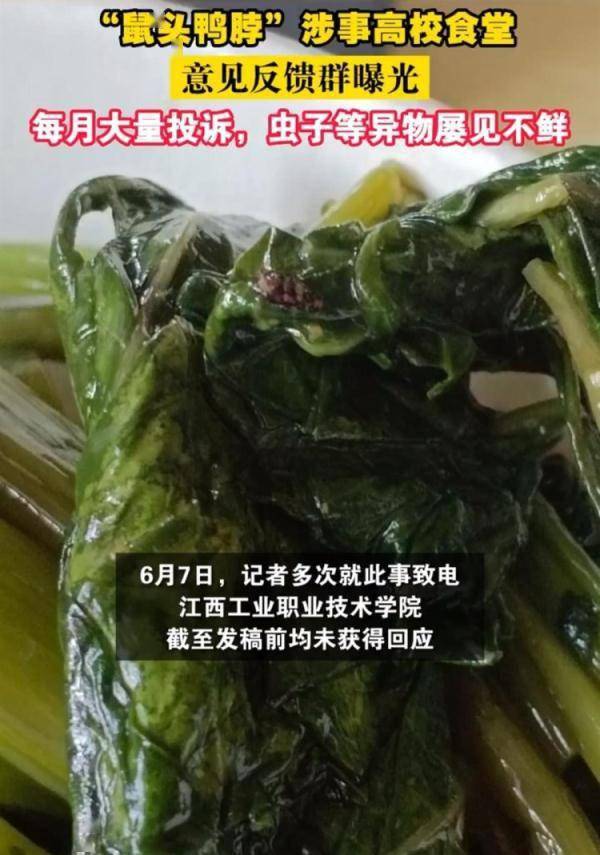 另据6月8日扬子晚报报道:该校食堂几乎每个月都有大量投诉,江西工业职业技术学院的一位学生告诉记者,食堂早前在聊天软件上建立了一个意见反馈群,每个月在群里学生投诉菜品问题的图片20张还不止,吃出钢丝球、头发、小虫子等异物的情况时有发生。