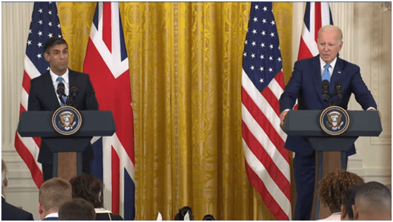 6月7日至8日,苏纳克首次正式访问美国。据白宫官网文字实录,英国首相苏纳克当地时间8日在华盛顿与美国总统拜登举行的联合记者会上大吹美英合作,他声称,“正如我们合作保护我们的国家安全一样,我们也必须越来越多地进行合作,保护我们的繁荣所依赖的经济安全”。