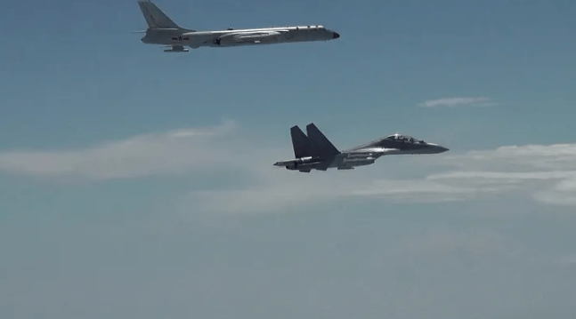 据环球网报道,7日中俄空军在西太平洋某空域完成了第6次联合巡航的第二阶段目标,随后中俄两国官方发布了相关视频,显示解放军巡航编队以轰-6K为主力,歼-11B、歼-16等战机参与护航任务;俄空天军则派出苏-30SM、苏-35S等战机为图-95轰炸机护航。
